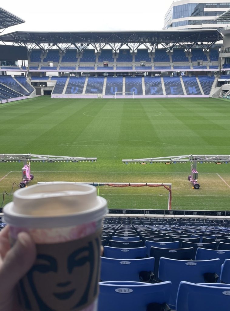 スタジアムは7時から23時まで解放されていて試合がない日は自由にスタンドに入れます。夜はスタンドからピッチを眺めながらお酒を飲むことだってできます。僕はスタジアム内にあるスタバでコーヒーを買ってゴール裏でモーニングをしました。